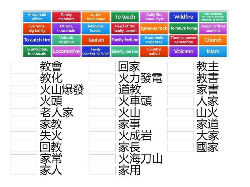 Volcano - 火山, Anger, critical moment - 火頭, Wildfire - 山火, To catch fire - 失火, Locomotive - 火車頭, Igneous rock - 火成岩, Great hardships (lit. "sea of fire and mountain of knives") - 火海刀山, Thermal power generation - 火力發電, Volcanic eruption - 火山爆發, Daily life, home-style - 家常, Family fortune - 家道, Family upbringing, tutor - 家教, Household affairs - 家事, Letter from home - 家書, Household expenses - 家用, Head of the family, parent - 家長, Family members - 家人, Others, household - 人家, Country, nation - 國家, Everyone, big family - 大家, To return home - 回家, Elderly person - 老人家, To enlighten, to educate - 教化, Church - 教會, To teach - 教書, Religious leader - 教主, Taoism - 道教, Islam - 回教,