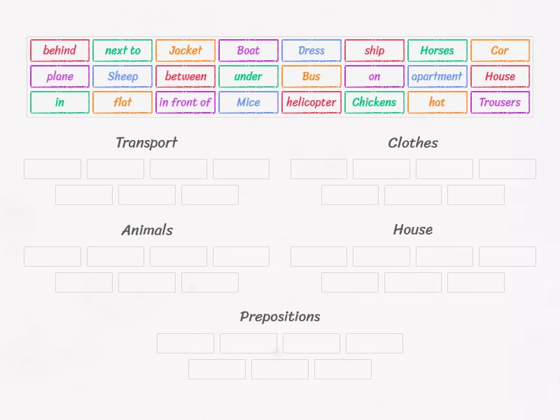 Transport: Boat, Car, helicopter, plane, ship, Bus, Clothes: Trousers, Jacket, Dress, hat, Animals: Horses, Sheep, Mice, Chickens, House: House, flat, apartment, Prepositions: on, in, under, next to, in front of, behind, between,