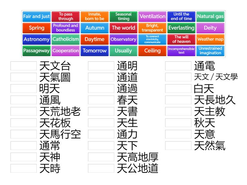 Deity - 天神, Innate, born to be - 天生, Seasonal timing - 天時, Incomprehensible text - 天書, The world - 天下, The will of heaven - 天意, Tomorrow - 明天, Daytime - 白天, Spring - 春天, Autumn - 秋天, Ceiling - 天花板, Weather map - 天氣圖, Natural gas - 天然氣, Observatory - 天文台, Astronomy - 天文 / 天文學, Catholicism - 天主教, Everlasting - 天長地久, Profound and boundless - 天高地厚, Fair and just - 天公地道, Until the end of time - 天荒地老, Unrestrained imagination - 天馬行空, Usually - 通常, Passageway - 通道, To connect electricity, communicate - 通電, Ventilation - 通風, To pass through - 通過, Cooperation - 通力, Bright, transparent - 通明,