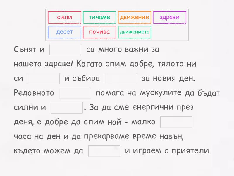 Сънят и ____ са много важни за нашето здраве! Когато спим добре, тялото ни си ____ и събира ____ за новия ден. Редовното ____ помага на мускулите да бъдат силни и ____. За да сме енергични през деня, е добре да спим най - малко ____ часа на ден и да прекарваме време навън, където можем да ____ и играем с приятели