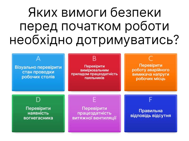 1) Яких вимоги безпеки перед початком роботи необхідно дотримуватись? a) Візуально перевірити стан проводки робочих столів b) Перевірити вимірювальним приладом працездатність паяльників c) Перевірити роботу аварійного вимикача напруги робочих місць d) Перевірити наявність вогнегасника e) Перевірити працездатність витяжної вентиляції f) Правильна відповідь відсутня 2) Як поділяються виробничі приміщення за ступенем електронебезпеки? a) без підвищеної небезпеки b) з підвищеною небезпекою c) особливо небезпечні d) особливо безпечні 3) Які фактори електронебезпеки визначають ступінь електронебезпеки? a) струмопровідна підлога b) пил та волога, що довгий час перевищує 80% c) можливість одночасного доторкання до струмоведучих частин обладнання та заземлених металевих предметів d) пил та волога, що довгий час перевищує 30% 4) До якої безпечної для життя людини величини зменшують напругу живлення трансформатори з 220В? a) 42В b) 40В c) 41В d) 32В 5) Які дії необхідно виконати в разі виходу з ладу паяльника? a) вимкнули блок живлення робочого місця та повідомити майстра b) ввімкнути блок живлення робочого місця та повідомити майстра c) не робити ніяких дій d) правильна відповідь відсутня 6) Яке допустиме навантаження на одну розетку для живлення електроприладів напругою 220В? a) 3 кВт b) 2 кВт c) 1 кВт d) 2,5 кВт 7) Чи можна виконувати будь-які радіомонтажні та ремонтні роботи в пристроях, що знаходяться під напругою? a) так b) ні 8) Яких вимог слід дотримуватися при роботі в радіомонтажній майстерні з метою запобігання виникнення пожежі? a) Слідкувати за якістю контактів в розетках блоків живлення b) Не допускати іскріння в з'єднаннях c) Використовувати тільки атестований електроінструмент d) Заборонено загромаджувати проходи між робочими столами та рядами робочих місць 9) Які дії необхідно виконати в разі виникнення пожежі? a) Вимкнути живлення майстерні за допомогою аварійного вимикача b) Вжити заходи для гасіння, для чого скористатися вогнегасником c) Повідомити адміністрацію училища та при потребі викликати пожежну команду по телефону d) Ввімкнути витяжну вентиляцію e) При неможливості ліквідувати пожежу своїми силами слід залишити приміщення майстерні, щільно прикривши за собою двері, які з коридору поливати водою до прибуття пожежної команди 10) Яки дії необхідно виконати у разі легкого ураження струмом? a) Вимкнути аварійний вимикач b) Надати ураженому зручної пози. Вкрити одягом, дати при можливості попити теплого напою c) Черговому сповістити медпункт училища або подзвонити в швидку допомогу по телефону 101 d) Перемістити постраждалого з місця ураження 11) Якими ознаками характеризується випадок тяжкого ураження струмом? a) Втратою свідомості, серцебиття та, як наслідок, відсутністю дихання в постраждалого b) Втратою крові та відсутністю дихання в постраждалого c) Відсутністю дихання в постраждалого d) Втратою зв'язку