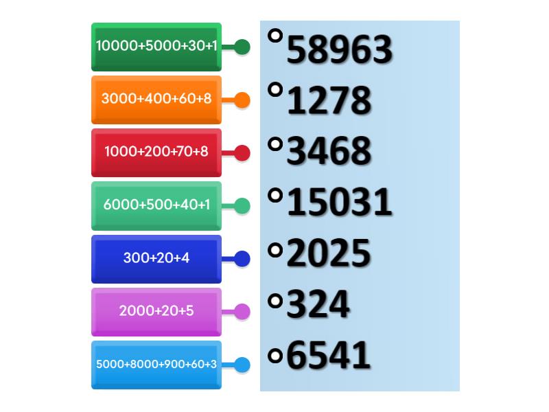 5000+8000+900+60+3, 1000+200+70+8, 3000+400+60+8, 10000+5000+30+1, 2000+20+5, 300+20+4, 6000+500+40+1.
