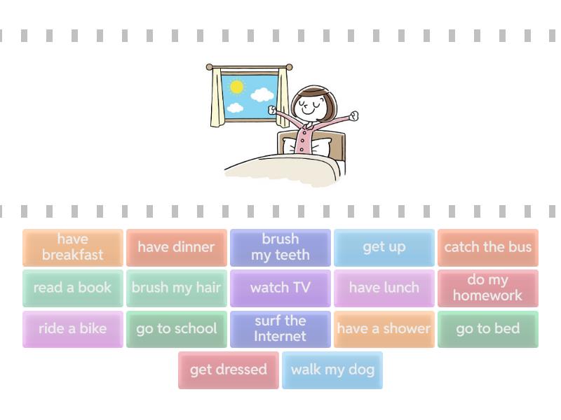 get up, get dressed, have breakfast, go to school, have lunch, brush my teeth, read a book, have dinner, watch TV, walk my dog, do my homework, have a shower, go to bed, ride a bike , surf the Internet , brush my hair, catch the bus,