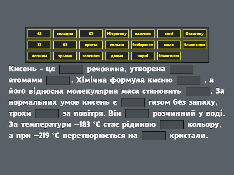 Кисень - це ____ речовина, утворена ____ атомами ____. Хімічна формула кисню ____ , а його відносна молекулярна маса становить ____. За нормальних умов кисень є ____ газом без запаху, трохи ____ за повітря. Він ____ розчинний у воді. За температури –183 °С стає рідиною ____ кольору, а при –219 °С перетворюється на ____ кристали.