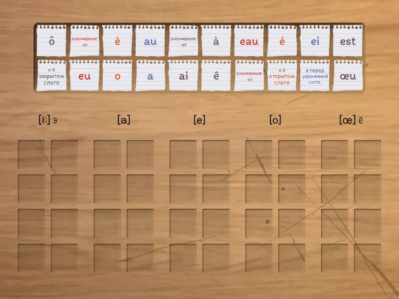 [ℇ] э: ai, ei, est, è, ê, e в закрытом слоге, е перед удвоенной согл., окончание -et, [a]: a, à, [e]: é, окончание -er, окончание -ez, [o]: o, ô, au, eau, [œ] ё: eu, œu, e в открытом слоге,