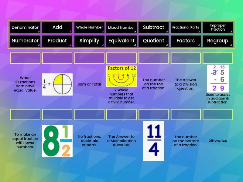 Improper Fraction, Numerator - The number on the top of a fraction., Denominator - The number on the bottom of a fraction., Fractional Parts, Equivalent - When 2 Fractions both have equal value. , Add - Sum or Total, Subtract - Difference, Product - The Answer to a Multiplication question., Quotient - The answer to a Division question., Simplify - To make an equal fraction with lower numbers., Regroup - Used to assist in addition & subtraction., Whole Number - No fractions, decimals or parts., Mixed Number, Factors - 2 Whole numbers that multiply to get a third number.,