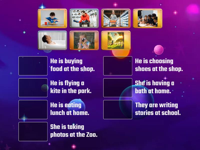 They are writing stories at school., She is having a bath at home., He is choosing shoes at the shop., He is buying food at the shop., He is flying a kite in the park., She is taking photos at the Zoo., He is eating lunch at home.,
