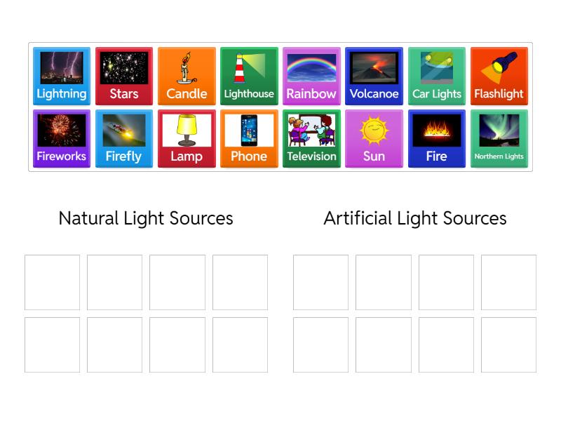 Natural Light Sources: Sun, Fire, Lightning, Firefly, Stars, Northern Lights, Volcanoe, Rainbow, Artificial Light Sources : Candle, Car Lights, Fireworks, Flashlight, Lamp, Lighthouse, Phone, Television,