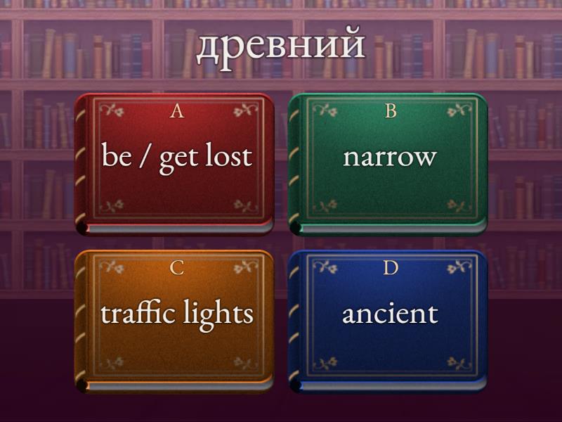 1) древний a) be / get lost b) narrow c) traffic lights d) ancient 2) заблудиться a) explore on foot b) facilities c) ancient d) be / get lost 3) быть основанным a) be founded b) lively c) guide d) neighbourhood 4) быть упомянутым a) ruins b) public transport c) be mentioned d) date back (to) 5) стоит сделать a) ruins b) be worth doing c) picturesque d) at the traffic lights 6) застроенный a) double-decker b) built-up c) ancient d) at the traffic lights 7) выхлопные газы машин a) heavy traffic b) car fumes c) double-decker d) be founded 8) рядом (под рукой) a) date back (to) b) close at hand c) at the roundabout d) traffic lights 9) перекрёсток a) well-kept b) built-up c) crossroads d) at the roundabout 10) на перекрёстке a) narrow b) multi-storey c) at the crossroads d) resident 11) датироваться (относиться к дате) a) unspoiled b) turning c) date back (to) d) pedestrian crossing 12) осматривать достопримечательности a) picturesque b) pedestrian area (zone) c) landfill d) do / go sightseeing 13) двухэтажный автобус a) residential area b) at the crossroads c) double-decker d) entertain 14) исследовать пешком a) explore on foot b) be / get lost c) resident d) pedestrian crossing 15) развлекать a) landfill b) entertain c) traffic lights d) at the roundabout 16) развлечение a) entertainment b) ruins c) crossroads d) at the crossroads 17) сооружения; оборудование; услуги a) facilities b) neighbourhood c) heavy traffic d) well-kept 18) передвигаться (по городу) a) pedestrian crossing b) multi-storey c) get around (the city) d) entertainment 19) гид, экскурсовод a) entertain b) be / get lost c) guide d) unspoiled 20) экскурсия с экскурсоводом a) at the crossroads b) well-kept c) landfill d) guided tour 21) интенсивное движение a) suffer (from) b) heavy traffic c) guided tour d) picturesque 22) проводить (организовывать) международные мероприятия a) facilities b) ruins c) crossroads d) hold internatioal events 23) автобусная экскурсия, когда можно зайти или выйти на любой остановке маршрута a) crossroads b) hop-on / hop-off bus tour c) heavy traffic d) take the second turning on the left 24) на окраине города a) get around (the city) b) picturesque c) in the suburbs d) be / get lost 25) мусорная свалка a) built-up b) guide c) landfill d) well-kept 26) оживлённый a) guide b) entertainment c) lively d) at the crossroads 27) многоэтажный a) entertain b) narrow c) multi-storey d) hop-on / hop-off bus tour 28) узкий a) facilities b) narrow c) be founded d) double-decker 29) район, квартал a) resident b) neighbourhood c) unspoiled d) facilities 30) пешеходная зона a) picturesque b) hop-on / hop-off bus tour c) at the crossroads d) pedestrian area (zone) 31) пешеходный переход a) crossroads b) facilities c) entertain d) pedestrian crossing 32) живописный a) landfill b) picturesque c) roundabout d) turning 33) общественный транспорт a) close at hand b) public transport c) traffic lights d) pedestrian area (zone) 34) житель a) at the crossroads b) resident c) guide d) ancient 35) жилой район a) public transport b) hop-on / hop-off bus tour c) entertain d) residential area 36) кольцевая развязка (круговое движение) a) entertain b) get around (the city) c) date back (to) d) roundabout 37) на кольцевой развязке a) at the crossroads b) at the roundabout c) ruins d) picturesque 38) руины a) date back (to) b) ancient c) guided tour d) ruins 39) страдать (от), пострадать a) unspoiled b) suffer (from) c) get around (the city) d) traffic lights 40) светофор a) public transport b) traffic lights c) at the traffic lights d) take the second turning on the left 41) на светофоре a) well-kept b) unspoiled c) at the traffic lights d) get around (the city) 42) поворот a) picturesque b) multi-storey c) public transport d) turning 43) поверните на втором повороте налево a) in the suburbs b) take the second turning on the left c) at the crossroads d) be founded 44) нетронутый, неиспорченный a) turning b) unspoiled c) well-kept d) residential area 45) содержащийся в порядке a) resident b) pedestrian area (zone) c) well-kept d) take the second turning on the left
