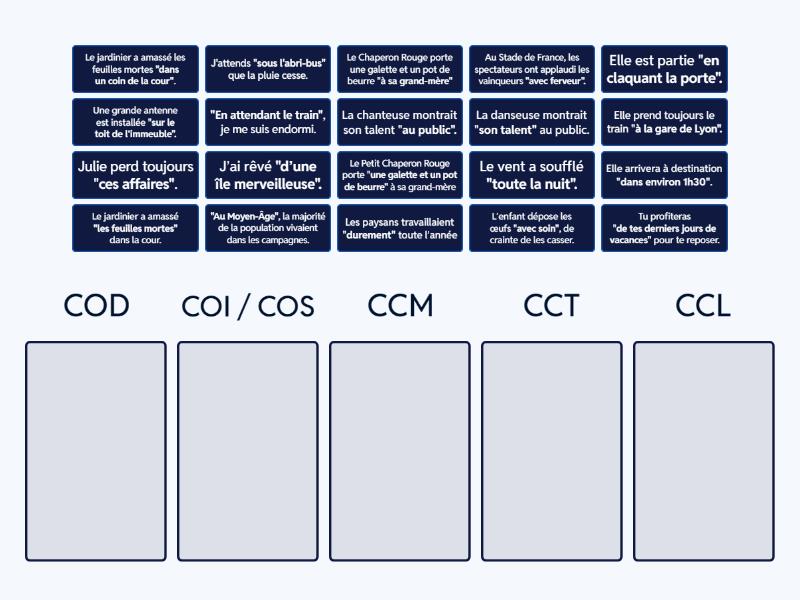 COD: Julie perd toujours "ces affaires"., Le Petit Chaperon Rouge porte "une galette et un pot de beurre" à sa grand-mère, La danseuse montrait "son talent" au public., Le jardinier a amassé "les feuilles mortes" dans la cour., COI / COS: Le Chaperon Rouge porte une galette et un pot de beurre "à sa grand-mère", Tu profiteras "de tes derniers jours de vacances" pour te reposer., La chanteuse montrait son talent "au public"., J’ai rêvé "d’une île merveilleuse"., CCM: Les paysans travaillaient "durement" toute l’année, Elle est partie "en claquant la porte"., L’enfant dépose les œufs "avec soin", de crainte de les casser., Au Stade de France, les spectateurs ont applaudi les vainqueurs "avec ferveur"., CCT: Elle arrivera à destination "dans environ 1h30"., "Au Moyen-Âge", la majorité de la population vivaient dans les campagnes., "En attendant le train", je me suis endormi., Le vent a soufflé "toute la nuit"., CCL: Elle prend toujours le train "à la gare de Lyon"., Une grande antenne est installée "sur le toit de l’immeuble"., J'attends "sous l'abri-bus" que la pluie cesse., Le jardinier a amassé les feuilles mortes "dans un coin de la cour".,