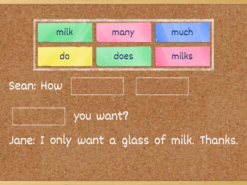 Luna: How ____ ____ do we have? Brian: We have ten oranges. Pete: How ____ ____ do you need for the cake? Mike: I don't need any. Judy: How ____ ____ ____ ____ on the farm? Ruby: There are twenty sheep there. Amy: How ____ ____ ____ your dad have? Jake: He has seven T-shirts. Sean: How ____ ____ ____ you want? Jane: I only want a glass of milk. Thanks. Hank: How ____ ____ ____ ____ in the gym? Gina: Thirty. Ryan: ____ ____ ____ ____ ____ in the park? Nina: There ____ only one boy.