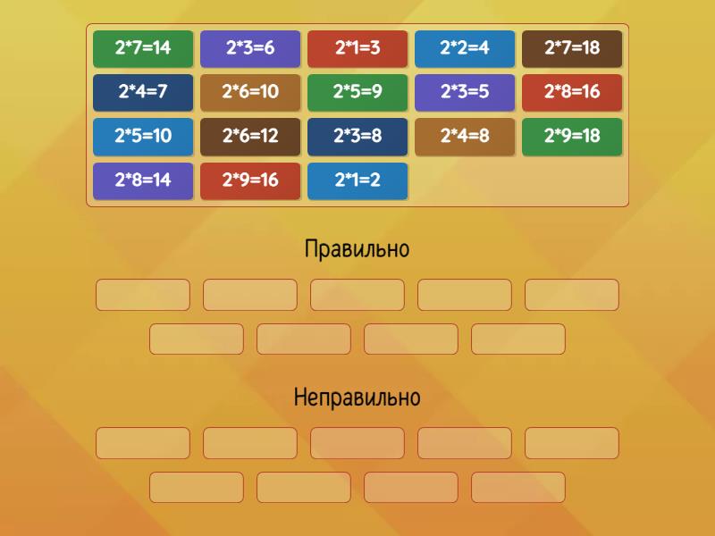 Правильно: 2*2=4, 2*7=14, 2*3=6, 2*1=2, 2*5=10, 2*8=16, 2*4=8, 2*9=18, 2*6=12, Неправильно: 2*6=10, 2*3=5, 2*8=14, 2*9=16, 2*1=3, 2*4=7, 2*5=9, 2*7=18, 2*3=8,