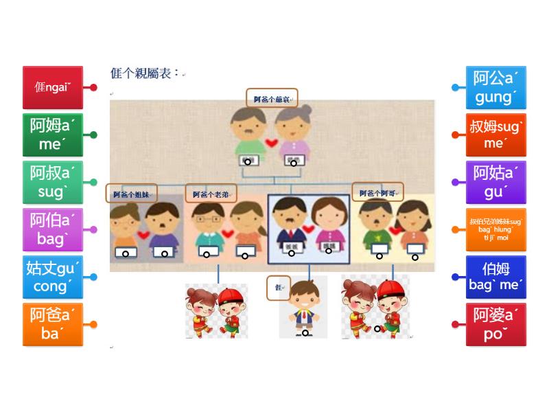 阿公aˊ gungˊ, 阿婆aˊ poˇ, 阿爸aˊ baˊ, 阿姆aˊ meˊ, 阿伯aˊ bagˋ, 伯姆 bagˋ meˊ, 阿叔aˊ sugˋ, 叔姆sugˋ meˊ, 阿姑aˊ guˊ, 姑丈guˊ congˊ, 𠊎ngaiˇ, 叔伯兄弟姊妹sugˋ bagˋ hiungˊ ti jiˋ moi.