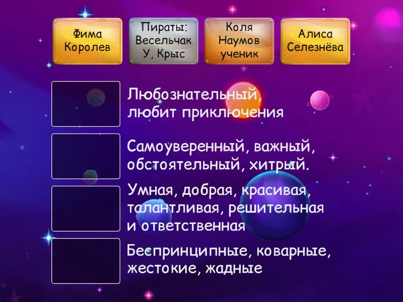 Пираты: Весельчак У, Крыс - Беспринципные, коварные, жестокие, жадные, Алиса Селезнёва - Умная, добрая, красивая, талантливая, решительная и ответственная, Коля Наумов ученик - Любознательный, любит приключения, Фима Королев - Самоуверенный, важный, обстоятельный, хитрый.,