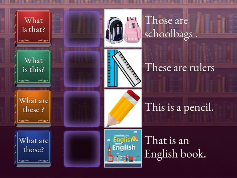 What are these ? - These are rulers, What are those? - Those are schoolbags ., What is that? - That is an English book., What is this? - This is a pencil.,