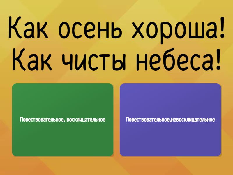 1) Как осень хороша! Как чисты небеса! a) Повествовательное, восклицательное b) Повествовательное,невосклицательное 2) Горе! Горе! Крокодил солнце в небе проглотил! a) Повествовательное, невосклицательное b) Повествовательное, восклицательное 3) Никто меня не жалеет! a) Повествовательное, восклицательное b) Повествовательное, невосклицательное