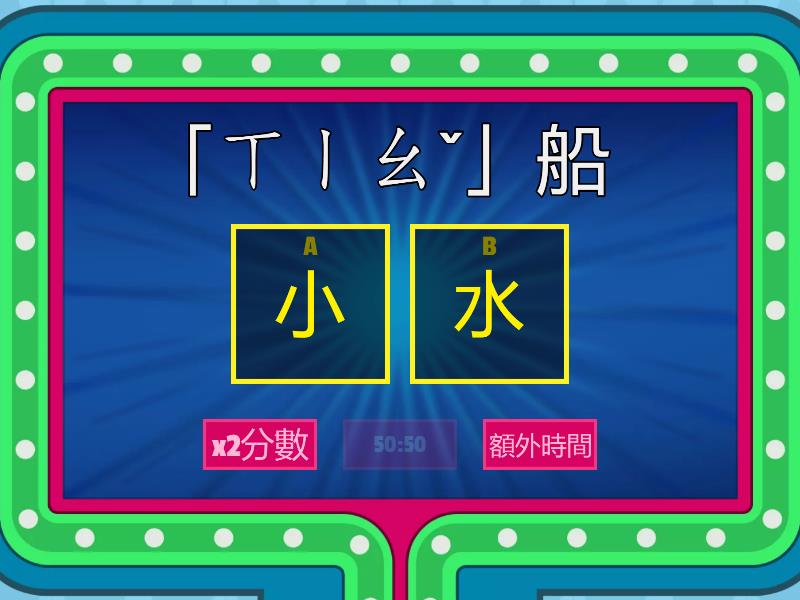 1) 「ㄒㄧㄠˇ」船 a) 小 b) 水 2) 「ㄗㄨㄛˇ」手 a) 左 b) 右 3) 加「ㄧㄡˊ」 a) 由 b) 油 4) 上 a) ㄕㄤˋ b) ㄒㄧㄚˋ 5) 也 a) ㄧㄝˋ b) ㄧㄝˇ 6) 一上一「」 a) 左 b) 下 7) 一「」一後 a) 前 b) 右 8) 走 a) ㄓㄡˇ b) ㄗㄡˇ 9) ㄌㄞˊ a) 魚 b) 來 10) 第「一」名 a) 一 b) ㄧˊ 11) 等「一」下 a) ㄧˊ b) ㄧˋ 12) 每「一」天 a) ㄧˋ b) ㄧˊ