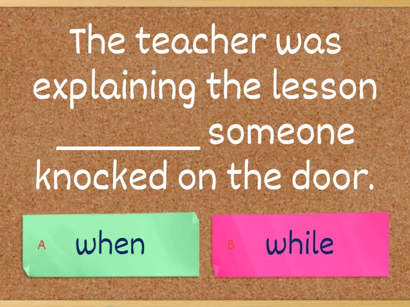 1) I was walking to school _______ it started to rain. a) when b) while 2) She was cooking dinner _______ her brother was setting the table. a) while b) when 3) We were watching a movie _______ the lights went out. a) when b) while 4) _______ I was studying, my phone rang. a) while b) when 5) He was driving home _______ he saw an accident. a) when b) while 6) _______ they were playing football, their parents were talking. a) while b) when 7) The teacher was explaining the lesson _______ someone knocked on the door. a) when b) while 8) I fell asleep _______ I was watching TV. a) while b) when 9) _______ we were having dinner, my sister was texting her friends. a) while b) when 10) She was listening to music _______ she was doing her homework. a) while b) when