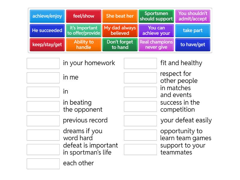 Don't forget to hand - in your homework, My dad always believed - in me, Real champions never give - in, He succeeded - in beating the opponent, She beat her - previous record, You can achieve your - dreams if you word hard, Ability to handle - defeat is important in sportman's life, Sportsmen should support - each other, keep/stay/get - fit and healthy, feel/show - respect for other people, take part - in matches and events, achieve/enjoy - success in the competition, You shouldn't admit/accept - your defeat easily, to have/get - opportunity to learn team games, it's important to offer/provide - support to your teammates,