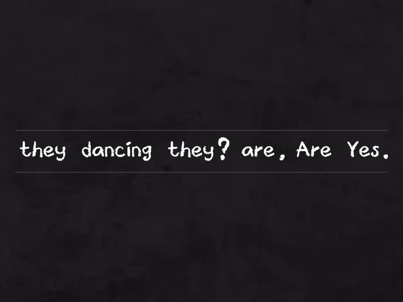 Are they dancing? Yes, they are., Is she singing? No, she isn't., Is he eating? No, he isn't., Is she sleeping? Yes, she is., Are they drinking? No, they aren't., What is he doing? , What are they doing? , What is she doing?, What are you doing?,