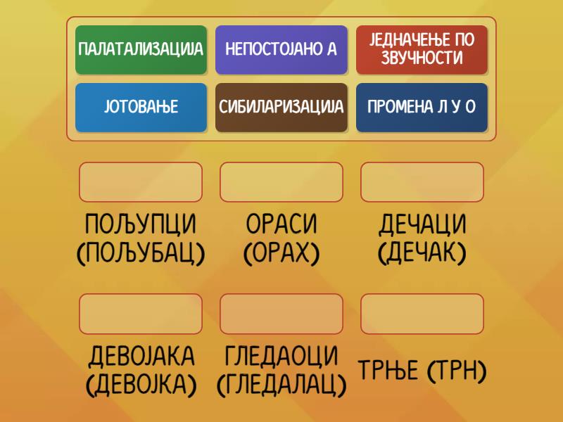 СИБИЛАРИЗАЦИЈА - ОРАСИ (ОРАХ), ПАЛАТАЛИЗАЦИЈА - ДЕЧАЦИ (ДЕЧАК), ЈОТОВАЊЕ - ТРЊЕ (ТРН), ЈЕДНАЧЕЊЕ ПО ЗВУЧНОСТИ - ПОЉУПЦИ (ПОЉУБАЦ), НЕПОСТОЈАНО А - ДЕВОЈАКА (ДЕВОЈКА), ПРОМЕНА Л У О - ГЛЕДАОЦИ (ГЛЕДАЛАЦ),