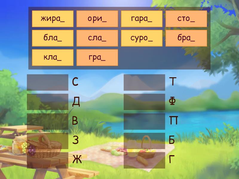 гра_ - Д, сла_ - Б, жира_ - Ф, суро_ - В, бла_ - Г, гара_ - Ж, ори_ - З, бра_ - Т, кла_ - С, сто_ - П,