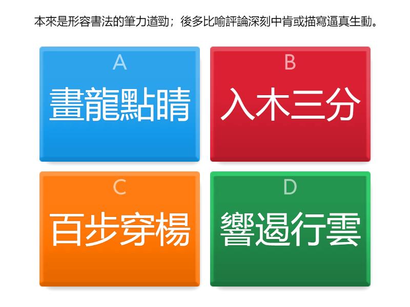 1) 本來是形容書法的筆力遒勁;後多比喻評論深刻中肯或描寫逼真生動。 a) 畫龍點睛 b) 入木三分 c) 百步穿楊 d) 響遏行雲 2) 比喻對事情能勝任愉快,從容而不費力。 a) 游刃有餘 b) 餘音繞樑 c) 雞鳴狗盜 d) 梧鼠五技 3) 比喻繪畫、作文時在最重要之處加上一筆,使全體更加生動傳神。 a) 黔驢技窮 b) 入木三分 c) 畫龍點睛 d) 庖丁解牛 4) 王醫師醫術高明,這個小手術對他而言如「」,游刃有餘。 a) 黔驢技窮 b) 入木三分 c) 畫龍點睛 d) 庖丁解牛 5) 形容音樂美妙感人,情韻綿長,餘味不絕。 a) 響遏行雲 b) 餘音繞樑 c) 雞鳴狗盜 d) 百步穿楊 6) 王警官是「」的神槍手。 a) 庖丁解牛 b) 游刃有餘 c) 雞鳴狗盜 d) 百步穿楊 7) 比喻射箭技術高超或技藝高強。 a) 百步穿楊 b) 游刃有餘 c) 梧鼠五技 d) 雞鳴狗盜 8) 這個老演員因為將這個角色內心的掙扎詮釋得「」,而獲得了奧斯卡獎。 a) 餘音繞樑 b) 雞鳴狗盜 c) 庖丁解牛 d) 入木三分 9) 在素色的服裝上加條色彩鮮豔的絲巾,可以收到「」的效果。 a) 庖丁解牛 b) 黔驢技窮 c) 濫竽充數 d) 畫龍點睛 10) 比喻對事物瞭解透澈,技藝精妙神奇,做起事來得心應手,運用自如。 a) 庖丁解牛 b) 入木三分 c) 濫竽充數 d) 畫龍點睛 11) 本來是形容書法的筆力遒勁;後多比喻評論深刻中肯或描寫逼真生動。 a) 入木三分 b) 雞鳴狗盜 c) 庖丁解牛 d) 畫龍點睛 12) 他愛說大話,炫耀自己的本領,其實也只會一些「 」的小伎倆而已。 a) 入木三分 b) 雞鳴狗盜 c) 餘音繞樑 d) 庖丁解牛 13) 他常說自己什麼樂器都會,其實是「」沒有一項專精。 a) 梧鼠五技 b) 濫竽充數 c) 黔驢技窮 d) 庖丁解牛 14) 世界三大男高音攜手合唱,運渾厚嘹亮的嗓音,「」,讓每個聽眾意猶未盡。 a) 入木三分 b) 庖丁解牛 c) 雞鳴狗盜 d) 餘音繞樑 15) 小王能力不足,卻執意接下這個新工作,結果落入「」的窘境。 a) 入木三分 b) 黔驢技窮 c) 庖丁解牛 d) 畫龍點睛 16) 比喻沒有真本領的人,靠冒充內行過日子;或比喻拿不好的東西混在好的之中,來冒充好的。 a) 入木三分 b) 畫龍點睛 c) 庖丁解牛 d) 濫竽充數 17) 形容歌聲響亮,高妙出眾,好像能止住浮雲。 a) 餘音繞樑 b) 梧鼠五技 c) 響遏行雲 d) 雞鳴狗盜 18) 比喻技能雖多卻沒有專長,不如專精一技。 a) 梧鼠五技 b) 響遏行雲 c) 雞鳴狗盜 d) 游刃有餘 19) 在競爭激烈的環境中,「」的人很難在職場上立足。 a) 黔驢技窮 b) 濫竽充數 c) 梧鼠五技 d) 庖丁解牛 20) 比喻僅有的拙劣本領已經使用完,想不出任何計策來。 a) 雞鳴狗盜 b) 梧鼠五技 c) 入木三分 d) 黔驢技窮 21) 比喻有某種卑下技能的人;或指卑微的技能。 a) 雞鳴狗盜 b) 游刃有餘 c) 響遏行雲 d) 入木三分