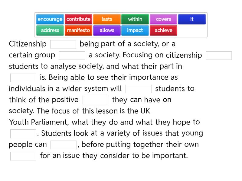 Citizenship ____ being part of a society, or a certain group ____ a society. Focusing on citizenship ____ students to analyse society, and what their part in ____ is. Being able to see their importance as individuals in a wider system will ____ students to think of the positive ____ they can have on society. The focus of this lesson is the UK Youth Parliament, what they do and what they hope to ____. Students look at a variety of issues that young people can ____, before putting together their own ____ for an issue they consider to be important.