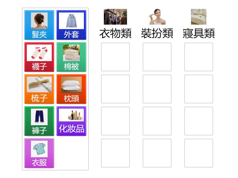 衣物類: 衣服, 褲子, 襪子, 外套, 裝扮類: 梳子, 化妝品, 髮夾, 寢具類: 棉被, 枕頭,