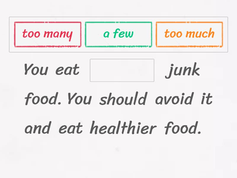 You eat ____ junk food. You should avoid it and eat healthier food. Are there ____ clean glasses in the cupboard? There are only ____ tomatoes in the fridge and they are getting old. We don't have ____ photos of our baby so we need to take more. You have ____ old receipts on your wallet. You should throw them away. I have saved ____ money this year. Now, I can afford that expensive laptop I wanted. They saw ____ nice tables and chairs in the furniture shop yesterday. I must go to the cash machine because I only have ____ money on me.