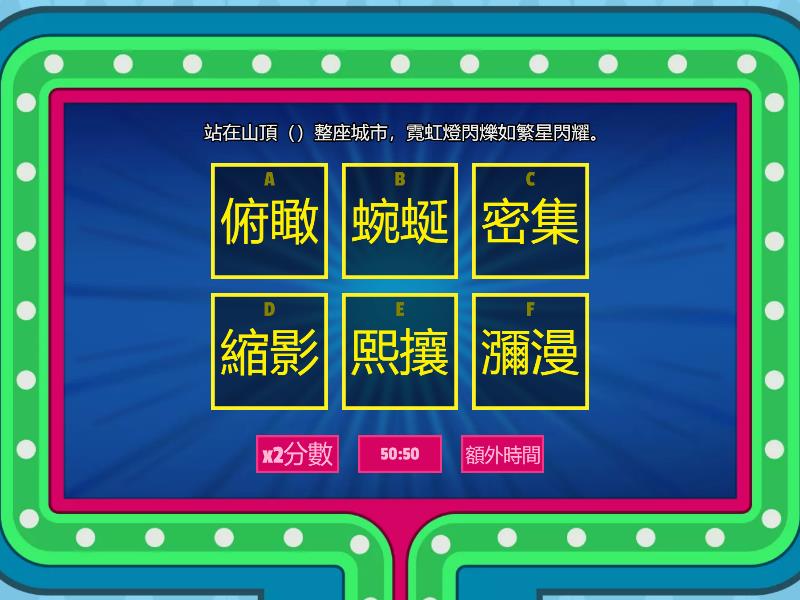 1) 站在山頂()整座城市,霓虹燈閃爍如繁星閃耀。 a) 俯瞰 b) 蜿蜒 c) 密集 d) 縮影 e) 熙攘 f) 瀰漫 2) 這條山路()曲折,穿越茂密的森林與陡峭的懸崖。 a) 俯瞰 b) 蜿蜒 c) 密集 d) 縮影 e) 熙攘 f) 瀰漫 3) 市中心的建築物(),狹窄的巷弄裡人流絡繹不絕。 a) 俯瞰 b) 蜿蜒 c) 密集 d) 縮影 e) 熙攘 f) 瀰漫 4) 這座小鎮是傳統文化的(),保留著古老的建築與習俗。 a) 俯瞰 b) 蜿蜒 c) 密集 d) 縮影 e) 熙攘 f) 瀰漫 5) 夜市裡人潮(),叫賣聲與談笑聲此起彼伏。 a) 俯瞰 b) 蜿蜒 c) 密集 d) 縮影 e) 熙攘 f) 瀰漫 6) 清晨的森林裡()著濃濃霧氣,彷彿夢境般神秘。 a) 俯瞰 b) 蜿蜒 c) 密集 d) 縮影 e) 熙攘 f) 瀰漫 7) 音樂會現場歡呼聲(),氣氛熱烈而震撼人心。 a) 此起彼伏 b) 龐然 c) 相安無事 d) 駐足 e) 老實 f) 若有所失 8) 我站在()的金字塔前,感受到自己的渺小。 a) 此起彼伏 b) 龐然 c) 相安無事 d) 駐足 e) 老實 f) 若有所失 9) 這兩隻貓雖然性格不同,卻能()地生活在一起。 a) 此起彼伏 b) 龐然 c) 相安無事 d) 駐足 e) 老實 f) 若有所失 10) 爸爸()在河邊,靜靜欣賞著夕陽倒映在水面的美景。 a) 此起彼伏 b) 龐然 c) 相安無事 d) 駐足 e) 老實 f) 若有所失 11) 班長是個()人,總是誠實守信,不願欺騙任何人。 a) 此起彼伏 b) 龐然 c) 相安無事 d) 駐足 e) 老實 f) 若有所失 12) 小志看著爸爸離去的背影,臉上露出()的神情,很不捨爸爸的離開卻又說不出口。 a) 此起彼伏 b) 龐然 c) 相安無事 d) 駐足 e) 老實 f) 若有所失