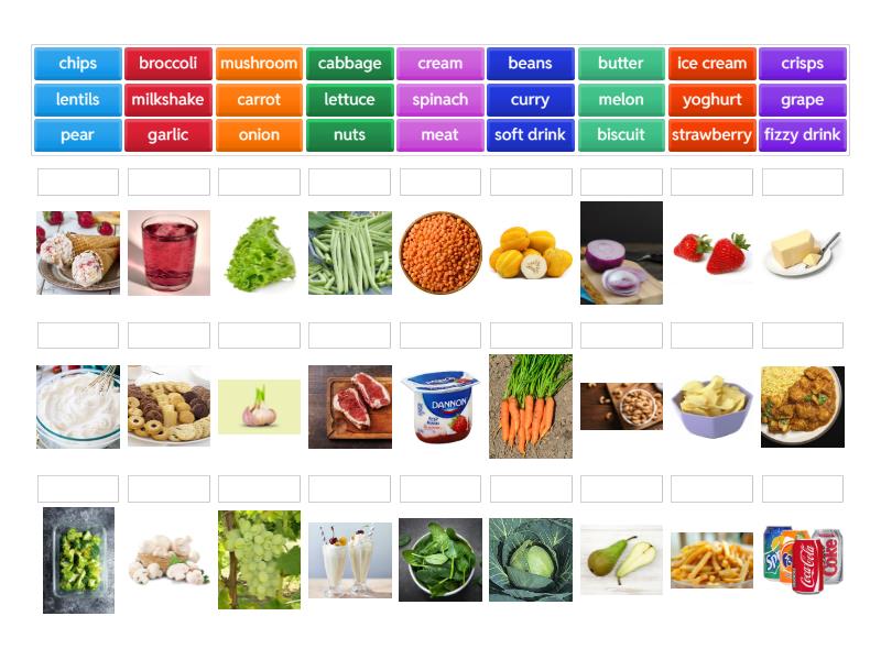 beans, biscuit, butter, yoghurt, chips, soft drink, strawberry, fizzy drink, ice cream, meat, milkshake, broccoli, cabbage , carrot , cream , crisps, curry , garlic, grape, lentils, lettuce, melon, mushroom , nuts, onion, pear, spinach ,