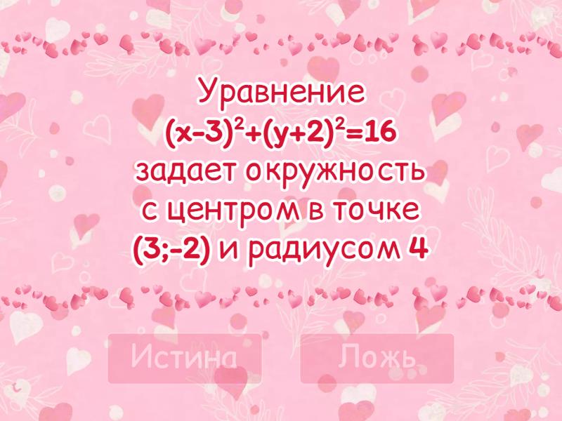 Истина: Уравнение (x-3)2+(y+2)2=16 задает окружность с центром в точке (3;-2) и радиусом 4, Точка (1;-2) является центром окружности, заданной уравнением (x-1)2+(y+2)2=25., Уравнение окружности с центром в начале координат и радиусом 5 имеет вид: x2+y2=25, Уравнение окружности с центром в точке (0;4) и радиусом 2 имеет вид: x2+(y-4)2=4, Уравнение (x-6)2+y2=36 задает окружность с центром в точке (6;0) и радиусом 6, Ложь: Уравнение окружности с центром в точке (x0,y0) и радиусом R имеет вид (x−x0)2-(y−y0)2 = R2, Уравнение (x+4)2+y2=9 задает окружность с центром в точке (-4;0) и радиусом 9, Точка (0;0) принадлежит окружности, заданной уравнением (x-5)2+(y-5)2=25, Уравнение (x+1)2+(y-1)2=1 задает окружность с центром в точке (1;-1),