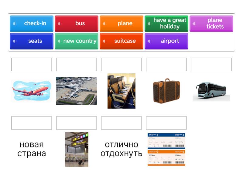 new country - новая страна, bus, airport, check-in, plane tickets, suitcase, seats, plane, have a great holiday - отлично отдохнуть,