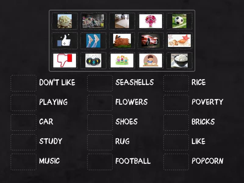 SEASHELLS, SHOES, RUG, POPCORN, BRICKS, PLAYING, FOOTBALL, MUSIC, FLOWERS, RICE, CAR, LIKE, DON'T LIKE, POVERTY, STUDY,