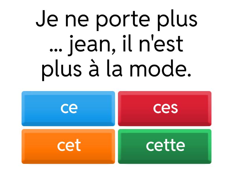 1) Je ne porte plus ... jean, il n'est plus à la mode. a) ce b) ces c) cet d) cette 2) Maintenant que tu as une moto, que feras-tu de ... vieux vélo? a) mes b) nos c) ton d) leurs 3) Vous pouvez admirer le panorama de la ville du haut de ... vieille tour. a) ce b) cette c) cet d) ces 4) La nuit les voitures allument ... phares. a) leur b) ses c) sa d) leurs 5) Tu savais que ... écrivain n'avait publié qu'un seul roman! a) cet b) ces c) cette d) ce 6) Si vous oubliez de lacer ... chaussures, vous allez tomber! a) votre b) notre c) leur d) vos 7) Malheureusement, je ne me rappelle pas le nom de ... personne intelligente. a) ce b) cet c) cette d) ces 8) La veille du départ, nous avons préparé ... bagages. a) nos b) ton c) notre d) leur 9) Il a passé des années heureuses de son enfance dans ... appartement étrange et mystérieux. a) ces b) cet c) ce d) cette 10) Pouvez-vous aider ma soeur à faire ... devoirs? a) ses b) son c) leur d) mon 11) Ne posez jamais ... question indiscrète. a) cet b) ce c) cette d) celle 12) Mesdemoiselles, voulez-vous laisser ... manteaux dans le vestiaire? a) tes b) ses c) leur d) vos 13) Quand a eu lieu ... entretien professionnel? a) cet b) ce c) cette d) celle 14) Ce dessin animé attire l'attention des parents et de... enfants. a) ses b) leur c) leurs d) son 15) Nous fréquentons ... établissement éducatif pour nous perfectionner. a) cette b) ce c) cet d) celle 16) Les autres bébés faisaient déjà ... premiers pas. a) ses b) leur c) leurs d) son 17) Il est important de faire ... exercice peu intéressant. a) cette b) ce c) cet d) celle 18) Des oiseaux ont fait ... nids sous le toit de notre maison. a) leur b) ses c) leurs d) son 19) Je ne veux pas abandonner mon ami dans ... situation compliquée. a) ce b) celle c) cette d) cet 20) Ils passent ... vacances au bord de la mer. a) ses b) leurs c) leur d) son 21) Si je ne me trompe pas, j'ai déjà lu ... revue mensuelle. a) cet b) ce c) cette d) ces 22) J'accepte ... invitation à venir passer quelques jours chez toi. a) notre b) ta c) leurs d) ton 23) Montre-moi ... photo que tu as prise il y a deux ans. a) cet b) ce c) cette d) ces 24) Ils se souviennent avec émotion de ... parents. a) son b) leur c) leurs d) ses 25) ... argument important m'a plongé dans une profonde réflexion. a) cet b) ce c) cette d) ces 26) Mets ... valises dans la chambre à coucher. a) leur b) notre c) tes d) votre 27) Il me regarde de ... air qu'on voit aux gros chiens. a) cet b) ce c) cette d) ces 28) Dans la salle d'attente vous rencontrez ... amis. a) notre b) vos c) votre d) leur 29) ... activité pouvait être pratiquée à pied. a) cet b) ce c) cette d) ces 30) ... rapport est excellent et vous l'avez rédigé à une vitesse extraordinaire. a) leurs b) ton c) vos d) votre