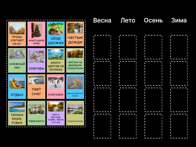 Весна: первоцветы, подснежники, тает снег, распускаются почки, Лето: много листьев, травы, яркое солнце, отдых , много цветов на полянах, теплое море, отдых, Осень: листья на деревьях пожелтели, частые дожди, птицы улетают на юг, сбор урожая, Зима: снежный лес, новогодняя елка, снеговик, снегирь,