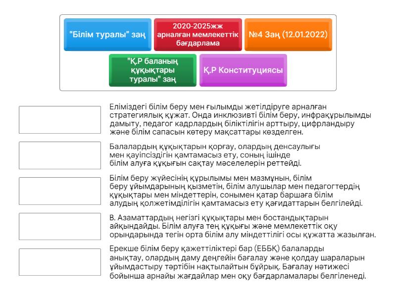 Қ.Р Конституциясы - B. Азаматтардың негізгі құқықтары мен бостандықтарын айқындайды. Білім алуға тең құқығы және мемлекеттік оқу орындарында тегін орта білім алу міндеттілігі осы құжатта жазылған., "Білім туралы" заң - Білім беру жүйесінің құрылымы мен мазмұнын, білім беру ұйымдарының қызметін, білім алушылар мен педагогтердің құқықтары мен міндеттерін, сонымен қатар баршаға білім алудың қолжетімділігін қамтамасыз ету қағидаттарын белгілейді., №4 Заң (12.01.2022) - Ерекше білім беру қажеттіліктері бар (ЕББҚ) балаларды анықтау, олардың даму деңгейін бағалау және қолдау шараларын ұйымдастыру тәртібін нақтылайтын бұйрық. Бағалау нәтижесі бойынша арнайы жағдайлар мен оқу бағдарламалары белгіленеді., 2020-2025жж арналған мемлекеттік бағдарлама - Еліміздегі білім беру мен ғылымды жетілдіруге арналған стратегиялық құжат. Онда инклюзивті білім беру, инфрақұрылымды дамыту, педагог кадрлардың біліктілігін арттыру, цифрландыру және білім сапасын көтеру мақсаттары көзделген., "Қ.Р баланың құқықтары туралы" заң - Балалардың құқықтарын қорғау, олардың денсаулығы мен қауіпсіздігін қамтамасыз ету, соның ішінде білім алуға құқығын сақтау мәселелерін реттейді.,