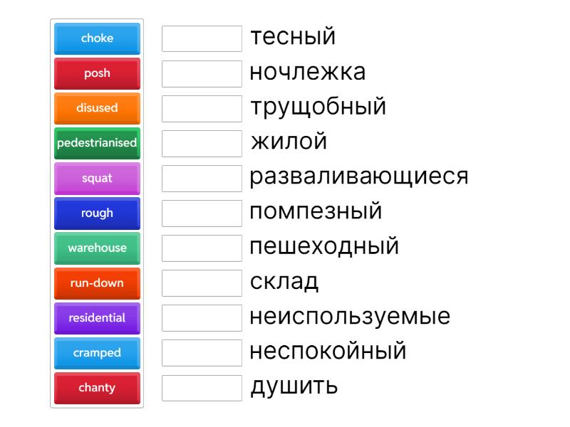 run-down - разваливающиеся, disused - неиспользуемые, residential - жилой, pedestrianised - пешеходный, squat - ночлежка, rough - неспокойный, posh - помпезный, cramped - тесный, warehouse - склад, choke - душить, chanty - трущобный,