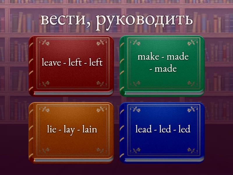 1) вести, руководить a) leave - left - left b) make - made - made c) lie - lay - lain d) lead - led - led 2) учить a) learn - learnt - learnt b) run- ran - run c) think - thought - thought d) wear - wore - worn 3) оставлять, уезжать a) tell - told - told b) leave - left - left c) lose - lost - lost d) win - won - won 4) лежать a) take - took - taken b) lie - lay - lain c) see - saw - seen d) sit - sat - sat 5) терять a) know - knew - known b) stick - stuck - stuck c) knit- knit - knit d) lose - lost - lost 6) делать, производить a) make - made - made b) lose - lost - lost c) spend - spent - spent d) sit - sat - sat 7) платить a) tell - told - told b) spoil - spoilt - spoilt c) spend - spent - spent d) pay - paid - paid 8) положить a) sew- sewed - sewn b) put - put - put c) think - thought - thought d) lead - led - led 9) читать a) win - won - won b) read - read - read c) sell - sold - sold d) teach - taught - taught 10) бежать a) run- ran - run b) leave - left - left c) spend - spent - spent d) put - put - put 11) сказать a) say - said - said b) leave - left - left c) knit- knit - knit d) know - knew - known 12) видеть a) wear - wore - worn b) see - saw - seen c) lead - led - led d) put - put - put 13) продавать a) tear - tore - torn b) spoil - spoilt - spoilt c) take - took - taken d) sell - sold - sold 14) посылать a) see - saw - seen b) run- ran - run c) send - sent - sent d) spread - spread - spread 15) петь a) sing - sang - sung b) see - saw - seen c) sit - sat - sat d) lose - lost - lost 16) сидеть a) learn - learnt - learnt b) win - won - won c) sit - sat - sat d) tell - told - told 17) спать a) spend - spent - spent b) say - said - said c) make - made - made d) sleep - slept - slept 18) тратить a) spend - spent - spent b) spread - spread - spread c) lose - lost - lost d) stick - stuck - stuck 19) портить a) knit- knit - knit b) spoil - spoilt - spoilt c) win - won - won d) spread - spread - spread 20) стоять a) think - thought - thought b) tell - told - told c) learn - learnt - learnt d) stand - stood - stood 21) плавать a) spoil - spoilt - spoilt b) lose - lost - lost c) swim - swam - swum d) run- ran - run 22) вязать a) pay - paid - paid b) spend - spent - spent c) teach - taught - taught d) knit- knit - knit 23) знать a) ride - rode - ridden b) know - knew - known c) sleep - slept - slept d) lead - led - led 24) ездить верхом a) lead - led - led b) ride - rode - ridden c) write - wrote - written d) know - knew - known 25) шить a) wear - wore - worn b) tell - told - told c) sew- sewed - sewn d) leave - left - left 26) распространять a) lead - led - led b) throw - threw - thrown c) spread - spread - spread d) teach - taught - taught 27) приклеивать a) sing - sang - sung b) stick - stuck - stuck c) lose - lost - lost d) spoil - spoilt - spoilt 28) брать a) take - took - taken b) learn - learnt - learnt c) say - said - said d) write - wrote - written 29) учить a) tear - tore - torn b) teach - taught - taught c) send - sent - sent d) write - wrote - written 30) говорить, приказать a) lose - lost - lost b) knit- knit - knit c) pay - paid - paid d) tell - told - told 31) рвать a) tear - tore - torn b) ride - rode - ridden c) sell - sold - sold d) spread - spread - spread 32) думать a) tear - tore - torn b) ride - rode - ridden c) think - thought - thought d) see - saw - seen 33) бросать a) stand - stood - stood b) think - thought - thought c) throw - threw - thrown d) tell - told - told 34) носить a) ride - rode - ridden b) lie - lay - lain c) wear - wore - worn d) sew- sewed - sewn 35) побеждать a) lead - led - led b) sell - sold - sold c) win - won - won d) lie - lay - lain 36) писать a) put - put - put b) stick - stuck - stuck c) write - wrote - written d) lie - lay - lain