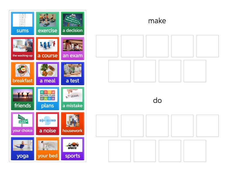 make: a meal, breakfast, your bed, plans, a decision, your choice, a noise, a mistake, friends, do: a test, an exam, exercise, sports, yoga, a course, housework, the washing-up, sums,