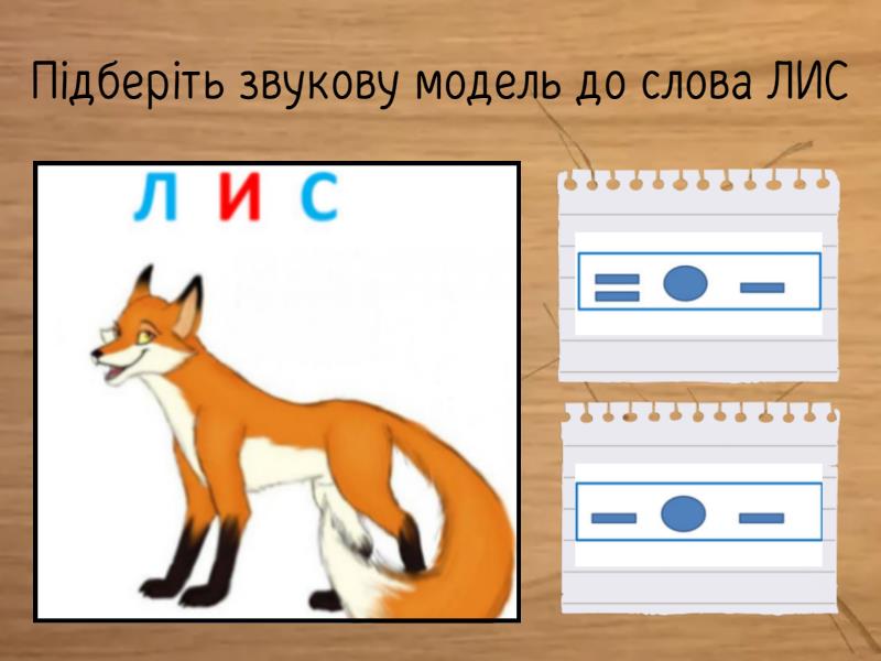 1) Підберіть звукову модель до слова ЛИС a) b) 2) Підберіть звукову модель до слова ЛІС a) b) 3) Підберіть звукову модель до слова ДИМ a) b) 4) Підберіть звукову модель до слова ДІМ a) b) 5) Підберіть звукову модель до слова ПЕНЬ a) b) 6) Підберіть звукову модель до слова НІЧ a) b) 7) Підберіть звукову модель до слова ДЕНЬ a) b)