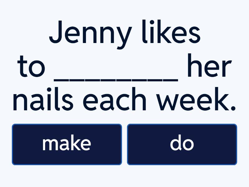 1) Jenny likes to ________ her nails each week. a) make b) do 2) My sister is ___________ well in her new job. a) doing b) making 3) I've_______________ some changes to the document. a) do b) done c) make d) made 4) My mother __________________ a comment about my shoes. She didn't like them. a) does b) did c) made d) makes 5) You're not trying hard enough! ____________ an effort! a) make b) do 6) Does everybody hate _____________ homework? a) making b) doing 7) Unfortunately, Lucy ____________ a lot of housework at the weekends. a) makes b) does 8) I'd like to ____________ a confession. I was the one who ate the last of the chocolate. a) make b) do 9) I've ______________ my decision. I'm going to go back to university. a) do b) make c) done d) made 10) I'm ____________ really well in my B10 course. I'm proud of myself. a) do b) making c) doing d) make