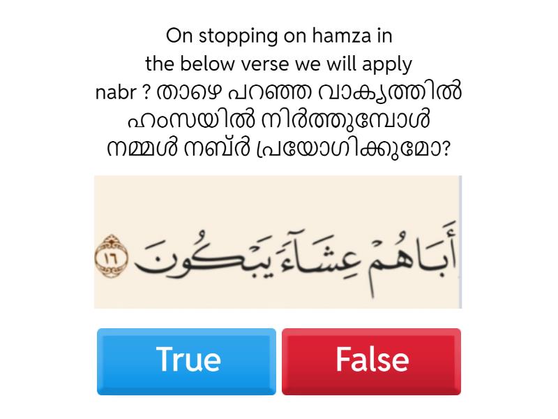 1) On stopping on hamza in the below verse we will apply nabr ? താഴെ പറഞ്ഞ വാക്യത്തിൽ ഹംസയിൽ നിർത്തുമ്പോൾ നമ്മൾ നബ്ർ പ്രയോഗിക്കുമോ? a) True b) False 2) Identify the number of noon sakina rules in the given ayah ? തന്നിരിക്കുന്ന ആയത്തിൽ എത്ര നൂൻ സാക്കീന നിയമങ്ങളുണ്ട്? a) 3 b) 4 c) 5 d) 6 3) While we stopping on the below verse which rule is applied. താഴെ പറഞ്ഞ വാക്യത്തിൽ നമ്മൾ നിർത്തുമ്പോൾ ഏത് നിയമം ബാധകം a) Qalqala b) Nabr c) both A and B d) None of the above 4) While we stopping on the below verse we have to give nabr on. താഴെയുള്ള വാക്യത്തിൽ നിർത്തുമ്പോൾ നമ്മൾ ________ ഇൽ നബ്ർ നൽകണം a) Both ء b) First ء c) Second ء d) None of the above 5) Find the odd one based on the secondary madd. ദ്വിതീയ മദ്ദ് അടിസ്ഥാനമാക്കി ഒറ്റപ്പെട്ട ഒന്ന് കണ്ടെത്തുക. a) b) c) d) 6) Identify the condition of raa while stopping on the above verse? മുകളിൽ പറഞ്ഞ വാക്യത്തിൽ നിർത്തുമ്പോൾ റാ യുടെ അവസ്ഥ തിരിച്ചറിയുക? a) Tarqeeq (3rd condition) b) Tafkheem(8th condition) c) Tafkheem (3rd condition) d) Tafkheem/ Tarqeeq 7) While stopping on this ayah we will give________ ഈ ആയത്തിൽ നിർത്തുമ്പോൾ ഞങ്ങൾ _________ നൽകും a) Sukoon to yaa b) Nabr to yaa c) Madd to qaf kesra d) Both a and c 8) Identify the qalqala level in this word while stopping ഈ വാക്കിൽ നിർത്തുമ്പോഴുള്ള ഖൽഖല ലെവൽ തിരിച്ചറിയുക. a) Qalqala Suhra b) Qalqala kubra c) Qalqala Uduma 9) Identify the word which has nabr നബ്ര് ഉള്ള പദം തിരിച്ചറിയുക a) b) c) d) None of the above 10) Identify when we are applying nabr to waw mushaddad? ശദ്ദ ഉള്ള ഒരു waw മായി ബന്ധപ്പെട്ട് നബ്ർ എപ്പോഴാണ് നടത്തേണ്ടത്? a) When the letter before it has a kasrah or fatha b) When the letter before it has a dhamma or a fatha c) When hamza is at the end of a word and before it's a wow. d) When it is followed by a madd lazim only 11) How do we read this word? ഈ വാക്ക് നമ്മൾ എങ്ങനെയാണ് വായിക്കുന്നത്? a) by pronouncing noon clearly without ghunna b) by merging the noon with ghunna c) by hiding the noon with heavy ghunna d) by hiding the noon with light ghunna 12) While reciting the below ayah we give fatha to all the hamzatul wasl because the second letter is lam. താഴെ പറഞ്ഞ ആയത്ത് പാരായണം ചെയ്യുമ്പോൾ എല്ലാ ഹംസത്തുൽ വസ്ലിലിനും നമ്മൾ ഫത്ഹ നൽകുന്നു, കാരണം രണ്ടാമത്തെ അക്ഷരം ലാം ആണ്. a) True b) False 13) In the given verse the lam sakinah rules are നൽകിയിരിക്കുന്ന വാക്യത്തിലെ ലാം സക്കീന നിയമങ്ങൾ ഇവയാണ് a) Merge the lam into the first letter b) Do not merge the lam and make it clear c) Both a and b d) None of the above 14) Which one is an example of madd laazim harfee muzhakkal occurring due to Idghaam bi ghunna ? മദ്ദ് ലാസിം ഹർഫീ മുസക്കൽ ഈദ്ഗാം ബി ഗുന്ന മൂലം സംഭവിക്കുന്നതിൻ്റെ ഉദാഹരണം ഏതാണ്? a) b) c) d) 15) Identify rules in following word താഴെ പറയുന്ന വാക്കിലെ നിയമങ്ങൾ തിരിച്ചറിയുക a) Madd Lazim &Qalqalah b) Madd lazim & Nabr c) Madd lazim ,Qalqalah and Nabr. d) Madd leen and Nabr 16) What is the sound level of a tafkheem letter that comes from the 9th Articulation point of tongue ? നാവിന്റെ ഒമ്പതാമത്തെ ആട്രിക്കുലേഷൻ പോയിന്റിൽ നിന്ന് വരുന്ന തഫ്ഖീം അക്ഷരത്തിന്റെ ശബ്ദത്തിന്റെ അളവ് എന്താണ്? a) 12,1,3 b) 1,1,3 c) 1,2,1,1 d) 1,1,1 17) Which of the following doesn’t have nabr while stopping? താഴെ കൊടുത്തിട്ടുള്ളവയിൽ നിർത്തുമ്പോൾ നബർ ഇല്ലാത്തത് ഏത് ? a) b) c) d) 18) Which rule is applicable in the given verse. തന്നിരിക്കുന്ന വാക്യത്തിൽ ഏത് നിയമമാണ് ബാധകമാകുന്നത്? a) Nabr , stopping on letter that has shaddah b) Lam mushaddad is tarqeeq due to kesra before it. c) Ilthiqaau sakinain , we give kesra to waw d) Ilthiqau sakinain , we drop the waw 19) All letters from the 3rd articulation point of the tongue have the same characteristics of heaviness, compression നാവിന്റെ മൂന്നാമത്തെ ആട്രിക്കുലേഷൻ പോയിന്റിൽ നിന്നുള്ള എല്ലാ അക്ഷരങ്ങൾക്കും ഭാരം, ഞെരുക്കൽ എന്നിങ്ങനെ ഒരേ സ്വഭാവസവിശേഷതകളുണ്ട്. a) True b) False 20) Identify the level of ghunna and reason for it ഗുന്നയുടെ അളവും അതിനുള്ള കാ
