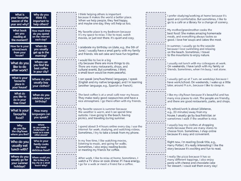 What is your favourite food? - I really like pizza because it has so many different toppings. I also enjoy pasta with cheese and chocolate cake for dessert. I could eat them every day!, What do you like to do in your free time? - In my free time, I like watching movies, listening to music, and going for walks. Sometimes, I also enjoy reading books or meeting my friends for coffee., When do you usually get up in the morning? - I usually get up at 7 a.m. on weekdays because I have work/school. On weekends, I wake up a little later, around 9 a.m., because I like to sleep in., What is your favourite season of the year and why? - My favorite season is summer because the weather is warm, and I can spend time outside. I love going to the beach, having picnics, and traveling during summer., What do you like to do after work? - After work, I like to relax at home. Sometimes, I watch a TV show or cook dinner. If I have energy, I go for a walk or meet a friend for a coffee., Where do you prefer to study/work - at home or in some other places? - I prefer studying/working at home because it’s quiet and comfortable. But sometimes, I like to go to a café or a library for a change of scenery., Who do you usually eat lunch with? - I usually eat lunch with my colleagues at work. On weekends, I have lunch with my family or friends. Sometimes, when I’m busy, I eat alone., Why do you think it's important to help others? - I think helping others is important because it makes the world a better place. When we help people, they feel happy, and maybe one day, they will help us too., Who in your family cooks the most delicious food? - My mother/grandmother cooks the best food! She makes amazing homemade meals, and everything always tastes so good. I love her soups and cakes the most., What is your favourite place in your house? - My favorite place is my bedroom because it’s my space to relax. I like to read, watch movies, or just rest there. It’s quiet and cozy., Where can you find the best coffee in your city? - The best coffee is at a small café near my house. They make really good cappuccinos and have a nice atmosphere. I go there often with my friends., What book are you reading at the moment? - Right now, I’m reading (book title, e.g., Harry Potter). It’s really interesting! I like the story because it’s exciting and fun to read., Where would you like to live, in a big city or a small town? Why? - I would like to live in a big city because there are more things to do. There are many restaurants, shops, and cultural events. But sometimes, I think a small town would be more peaceful., How much time do you spend on the internet each day? - I spend about 3-4 hours online every day. I use the internet for work, studying, and watching videos. Sometimes, I try to take a break from my phone., Where do you usually go for your summer holidays? - In summer, I usually go to the seaside because I love swimming and relaxing on the beach. Sometimes, I travel to the mountains to enjoy nature., How many languages can you speak? - I can speak (one/two/three) languages. I speak (English and my native language), and I’m learning (another language, e.g., Spanish or French)., When do you celebrate your birthday? - I celebrate my birthday on (date, e.g., the 5th of June). I usually have a small party with my family and friends. We eat cake and have fun together., Why do you like the city/town where you live? - I like my city/town because it’s beautiful and has many nice places to visit. The people are friendly, and there are good restaurants, parks, and shops., How far is your school/work from your house? - My school/work is about (distance, e.g., 20 minutes) away from my house. I usually go by bus/train/car, or sometimes I walk if the weather is nice., Where do you usually buy your clothes? - I usually buy my clothes at shopping malls because there are many stores to choose from. Sometimes, I shop online because it’s easy and convenient.,