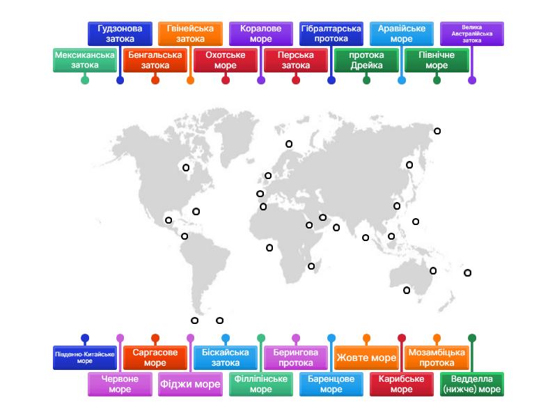 Баренцове море, Охотське море, Жовте море, Північне море, Фіджи море, Південно-Китайське море, Філліпінське море, Саргасове море, Коралове море, Аравійське море, Карибське море, Мозамбіцька протока, Ведделла (нижче) море, Червоне море, Гудзонова затока, Мексиканська затока, Бенгальська затока, Велика Австралійська затока, Біскайська затока, Перська затока, Гвінейська затока, протока Дрейка, Берингова протока, Гібралтарська протока.