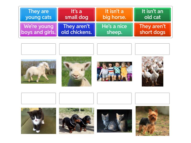 It isn't an old cat, They are young cats, It's a small dog, They aren't short dogs, He's a nice sheep., We're young boys and girls., It isn't a big horse., They aren't old chickens.,