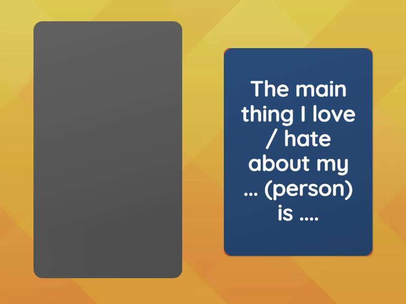 What scares me most about ... is the amount of ... I know it's going to end up taking. , The main thing I love / hate about my ... (person) is ...., What I love most about ... is the way ... , What I’m finding weirdest about ... is the fact that ..., The thing I find most ... about my ... (person) is ...., All I tend to do most ... (day / time) is ... and ...., The place I’d most like to visit is ...., One ... I have absolutely no interest in visiting / trying is ... ., The main reason that I ... (activity) is ... , The main things that frustrates me these days is ... ., What upsets me the most about ... is ... , One thing that really drives me crazy is the way ..., The main reason I come to these meetings is ... .