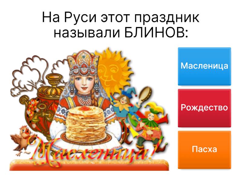1) На Руси этот праздник называли БЛИНОВ: a) Масленица b) Рождество c) Пасха 2) Что провожает Масленица? a) осень b) весну c) зиму d) лето 3) Масленица на Руси длится неделю. Укажите день, характеризующий встречу a) понедельник b) вторник c) четверг 4) Почему пекут блины на масленицу? a) это символ СОЛНЦА b) просто вкусно c) они похожи на колобок d) не знаю 5) На чем пекут блины a) на чайнике b) на тарелке c) на сковороде 6) Символом чего является блин a) луны b) бога c) блина d) солнца 7) Как заканчивается поговорка: «Первый блин …» a) тёще b) комом c) самый вкусный 8) Есть поговорка: «Даже самый холодный человек любит …». Что именно: a) горячие блины b) провожать зиму c) водить хоровод 9) Какая масленичная забава требует хорошей физической подготовки, ловкости и выносливости: a) сжигание чучела b) поедание блинов c) залезание на столб 10) Из какого материала обычно делают чучело на Масленицу a) бумага b) солома c) пластик 11) Чучело из соломы на Масленицу, это символ чего? a) лета b) зимы c) весны d) осени 12) Сколько дней празднуют Масленицу? a) 2 дня b) 1 день c) 5 дней d) 7 дней