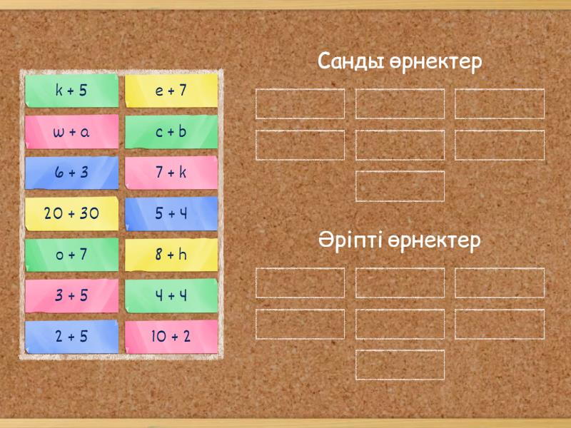 Санды өрнектер: 10 + 2 , 3 + 5 , 20 + 30 , 5 + 4 , 6 + 3, 2 + 5 , 4 + 4 , Әріпті өрнектер: o + 7 , k + 5 , 8 + h , e + 7 , w + a , c + b , 7 + k,